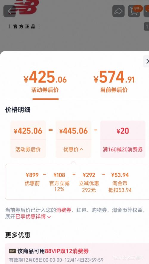商品到手价425元+53.94元淘金币,根据小编提供的优惠信息(优惠券+如何使用淘金币抵扣+88vip 双12 88折/9折 780元消费券 至高抵(20/60/200/500)+慢津贴1元),下单1件。好价不错过,感兴趣的朋友可以试试!