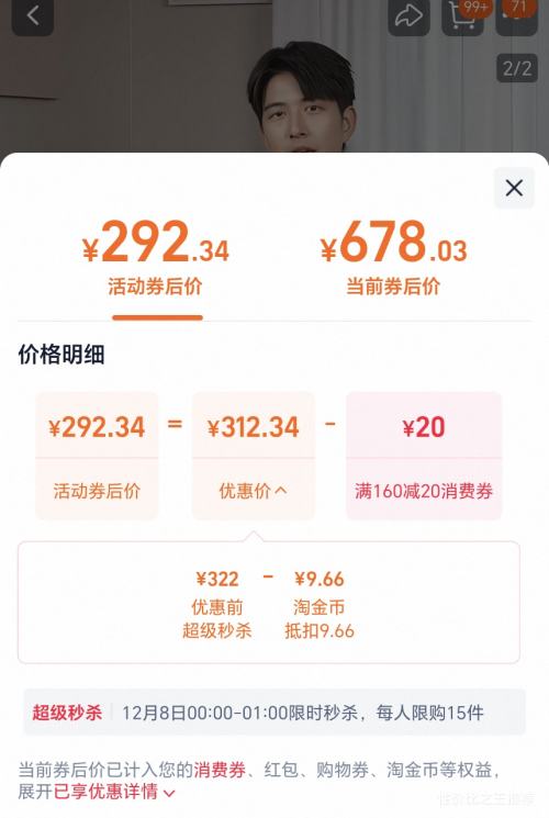 商品到手价292.34元(仅限前1小时),根据小编提供的优惠信息(优惠券+如何使用淘金币抵扣+88vip 双12 88折/9折 780元消费券 至高抵(20/60/200/500)+满500减40),下单1件。好价不错过,感兴趣的朋友可以试试!