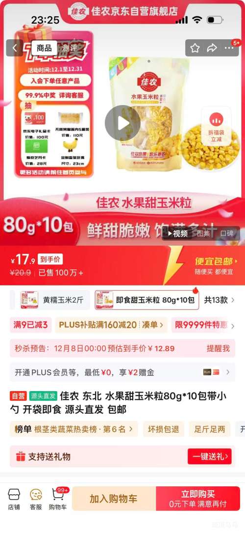 京东自营再降价、8日:佳农 东北 水果甜玉米粒 80g*10包 带小勺