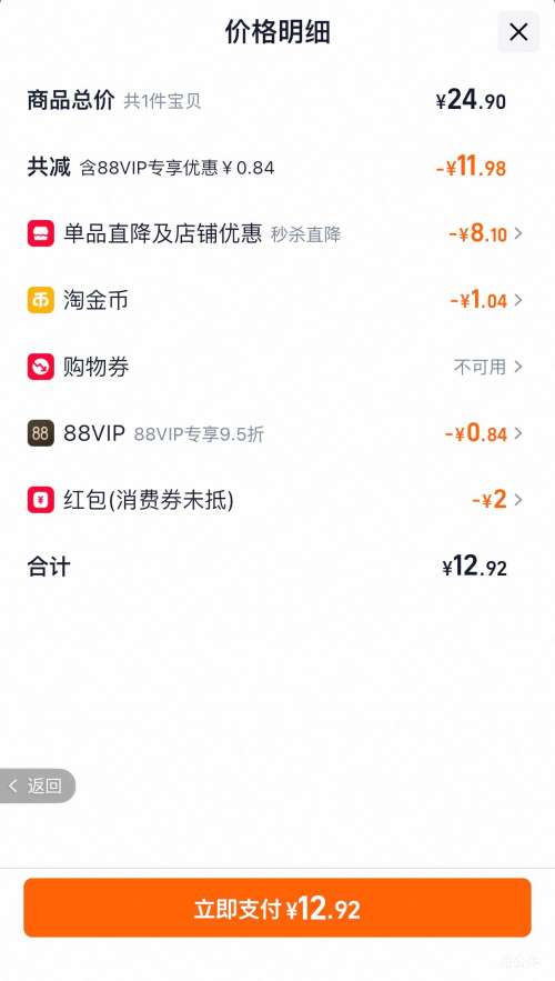 商品到手价12.92元+1.04元淘金币,根据小编提供的优惠信息(优惠券+如何使用淘金币抵扣),下单1件。好价不错过,感兴趣的朋友可以试试!