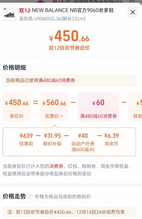 商品到手价450.66元,根据小编提供的优惠信息(优惠券+运动户外券满600减40+如何使用淘金币抵扣+88vip 双12 88折/9折 780元消费券 至高抵(20/60/200/500)),下单1件。好价不错过,感兴趣的朋友可以试试!