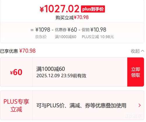 商品到手价1027.02元,下单1件。好价不错过,感兴趣的朋友可以试试!